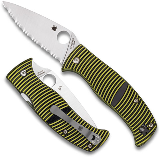 Spyderco C217G Caribbean G-10 Black/Yellow Leaf. One of the latest and most stylish additions to Spyderco's growing Salt Series of knives, the Caribbean is unique in several ways. Its full-flat-ground, leaf-shaped blade is precision machined from LC200N-a nitrogen-based martensitic steel that holds and edge extremely well and is completely rustproof. Available with either a PlainEdge or fully serrated SpyderEdge, the blade is housed in a vibrantly colored handle featuring scales crafted from layered black and yellow G-10. The intricately machined pattern on the scales not only creates a non-slip texture, it reveals the contrasting colors of the layers to create a stunning striped design. Skeletonized stainless steel liners nested within the scales anchor the knife's high-strength Compression Lock mechanism, while a reversible titanium hourglass clip offers convenient left or right-side tip-up carry. By Spyderco.