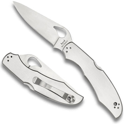Byrd Cara Cara2 Stainless Steel has a full-flat ground high performance 8Cr13MoV blade. Shaped like a "comet" the hole in the blade symbolizes quality and careful manufacturing tolerances. On the blade's spine is a group of crosshatching called jimping. Jimping enhances the thumb's grip on top of the blade making cutting slip-resistant. Available for the first time with a four-way clip that carries tip-up/tip down or left/right-handed, it attaches inside a pant's pocket where it rides deep and confidently. A finger choil enhances the ergonomic stainless steel handle adding comfort and control. Mid-positioned back lock has a David Boye cut away dent, a safety feature that allows tightly gripping the handle without unintentionally releasing the lock. By Spyderco.