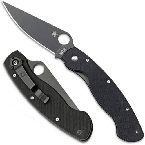 The C36GBK (Military Model Black Blade) features machined texturing on the spine behind the hole for a very comfortable and safe grip. By Spyderco.