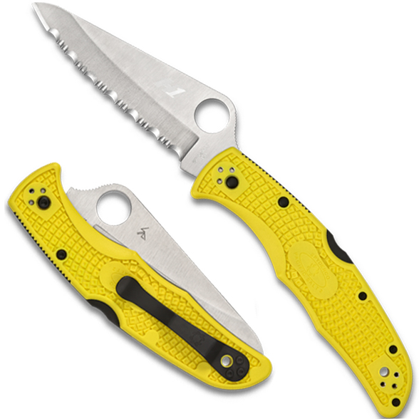 The C91YL Pacific Salt 2 FRN Yellow. The Pacific Salt 2 epitomizes Spyderco's relentless pursuit of Constant Quality Improvement (C.Q.I.) in everything we do. It combines the ultra-corrosion-resistant qualities of H-1 blade steel with the refined ergonomics and four-position pocket clip of the best-in-class Endura 4 Lightweight. Its linerless construction also further reduces the knife’s weight and its vulnerability to corrosion. This version of the Pacific Salt 2 features a bright yellow handle that is easy to see in and around the water with a choice of a PlainEdge or fully serrated SpyderEdge blade. By Spyderco.