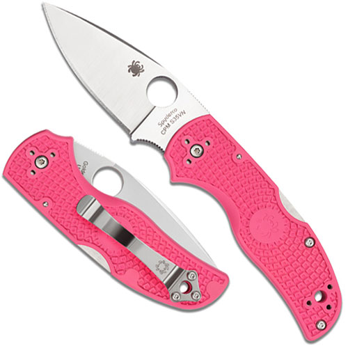 Spyderco C41PPN5 Native 5 Pink with pink FRN handle and CPM S35VN blade. The eye-catching pink-handled Native 5 Lightweight offers the same high-performance reliability as our standard Native 5 Lightweight, but with the added benefit of a vibrant pink handle. Its PlainEdge blade is full-flat ground from premium CPM S35VN niobium-enriched stainless steel. The blade's Trademark Round Hole allows convenient one-handed opening and is supported by a highly refined back lock mechanism that offers outstanding strength and ease of use. By Spyderco.