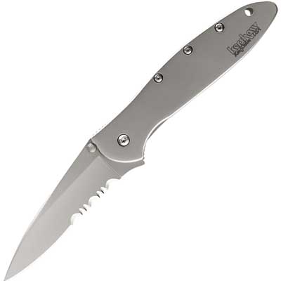 Leek (serrated blade) pocket-sized knife with removable pocket clip, Speed-Safe opening system and tip safety lock. By Kershaw.