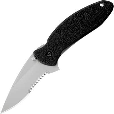Scallion (serrated blade) pocket-sized knife with removable pocket clip, Speed-Safe opening system and tip safety lock. By Kershaw.