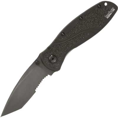 Tactical Blur (black, tanto serrated edge) pocket-sized knives designed by the famous knife designer Ken Onion. Features Speed-Safe opening system, Trac-Tec inserts for secure grip and removable pocket clip. By Kershaw.
