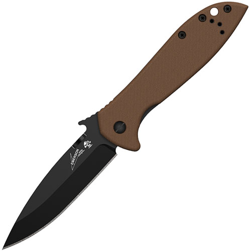 Kershaw Knives and Emerson Knives have joined forces on a series of knives that combine the precision engineering of Kershaw with Emerson's uncompromising functional design. The CQC-4K features a drop-point blade for multi-purpose cutting capability. Black-oxide coating protects the blade and makes it non-reflective, too. A textured G-10 front scale in coyote brown offers a secure grip. The handle back is stainless steel with black-oxide coating. For a safe and solid blade lock up, the CQC-4K has a frame lock. The CQC-4K is a manual opener using either the thumb disk or the patented Emerson "wave shaped feature." This opening feature enables the knife to be opened as it is removed from the pocket. By the time the knife has been fully withdrawn from the pocket, the blade is deployed and ready for use. A small wave-shaped tab on the top of the blade is built to catch on the pocket seam, opening the knife as it comes out of the pocket. This instant-open feature is a favorite among military, rescue, and law enforcement knife users. The pocketclip is reversible for left- or right-handed carry. By Kershaw.