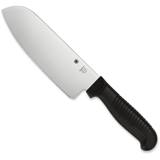 Spyderco's involvement in kitchen knives dates back to the early 1980’s and the beginnings of the company's knife production. After being discontinued a number of years ago, they are now back by popular demand and better than ever. The K08 Santoku has a special place in Spyderco's history, as we were the first company to introduce a commercial santoku into the U.S. market. This unique Japanese kitchen knife design straddles the line between a traditional Asian cleaver and a Western chef's knife and performs the tasks of both exceedingly well. Its 6.81-inch blade is made from premium MBS-26 stainless steel blade, ground exceptionally thin and meticulously heat treated for optimal edge retention. The durable black polypropylene plastic handle is injection molded directly onto the tang of the blade and features a distinctive "stepped" texture pattern that provides amazing comfort and control during use. If you're a serious chef, you owe it to yourself to give the Santoku a try. Once you do, you'll wonder how you ever got along without one. By Spyderco.