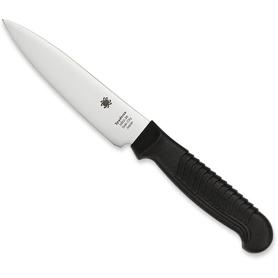 Spyderco's involvement in kitchen knives dates back to the early 1980’s and the beginnings of the company's knife production. After being discontinued a number of years ago, they are now back by popular demand and better than ever. Our current kitchen knives combine all the distinctive features of the originals with an improved handle material that offers increased durability. The K05 Utility Knife has a 4.48-inch drop-point blade that offers an excellent balance of control and cutting performance. This makes it incredibly versatile and adaptable to many kitchen cutting chores and utility applications. Like the original version, it features a premium MBS-26 stainless steel blade, ground exceptionally thin and meticulously heat treated for optimal edge retention. Its durable polypropylene plastic handle is injection molded directly onto the tang of the blade and features a distinctive "stepped" texture pattern that provides amazing comfort and control during use. By Spyderco.