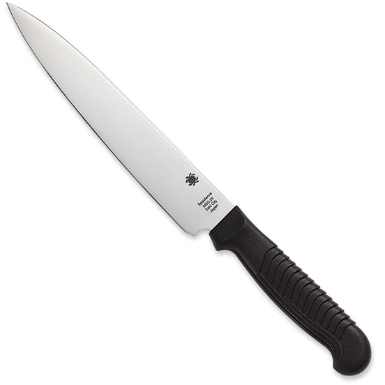 Spyderco's involvement in kitchen knives dates back to the early 1980’s and the beginnings of the company's knife production. After being discontinued a number of years ago, they are now back by popular demand and better than ever. Our current kitchen knives combine all the distinctive features of the originals with an improved handle material that offers increased durability. The K04 Utility Knife has a 6.5-inch drop-point blade that is ideal for a broad range of kitchen cutting chores, making it the most popular "go-to" knife in many home and commercial kitchens. Like the original version, it features a premium MBS-26 stainless steel blade, ground exceptionally thin and meticulously heat treated for optimal cutting performance. Its durable polypropylene plastic handle is injection molded directly onto the tang of the blade and features a distinctive "stepped" texture pattern that provides exceptional comfort and control during use. This version of the K04 features a razor sharp PlainEdge or a SpyderEdge blade with a unique two-step serration pattern that protects the edge from dulling on cutting boards. By Spyderco.