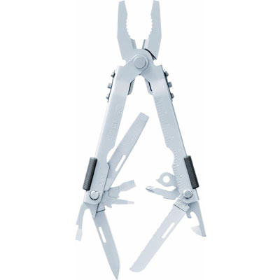 Multi-Plier 600, Bluntnose, Tungsten Carbide. BluntNose Pliers, Fine Edge Knife, Serrated Knife, Phillips Driver, Small Flat Driver, Medium Flat Driver, Large Flat Driver, Ruler, Lanyard Ring, Bottle Opener, Can Opener, File, Tungsten Carbide Wire Cutters, Wire Crimper, Ballistic Nylon Sheath. By Gerber.