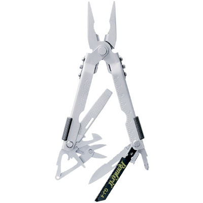 Multi-Plier 600, Pro Scout Tool Kit. Needle Nose Pliers. Fine Edge Knife, Serrated Knife, Phillips Driver, Small Flat Driver, Medium Flat Driver, Large Flat Driver, Ruler, Lanyard Ring, Bottle Opener, Can Opener, File, Wire Cutters, Wire Crimper, Ballistic Nylon Sheath. By Gerber.