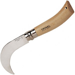 Opinel No 10 Garden Pruning folding knife. With its curved blade bevelled on both sides, this is the ideal tool for grape-picking, shrub pruning or cutting ties. Pierced handle. By Opinel Knives.