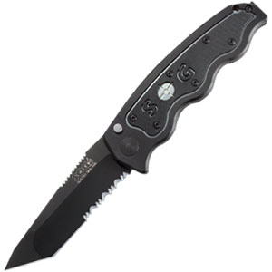 The SOG-TAC Automatic (Tanto Black TiNi) is an invigorating new design that looks like nothing else. It is big, but relatively slim, and specifically tailored to the professional. Blade travel is definitely fast and once open it locks up like a floor safe. The machined 6061-T6 hard-anodized aluminum is inset with G10 type textured inlays for increased grip. Includes: A safety button that double locks the blade in the open/closed position, our reversible bayonet style clip and a practical tactical Tanto blade. Luminescent painted logo for easy location at night. By SOG Knives.