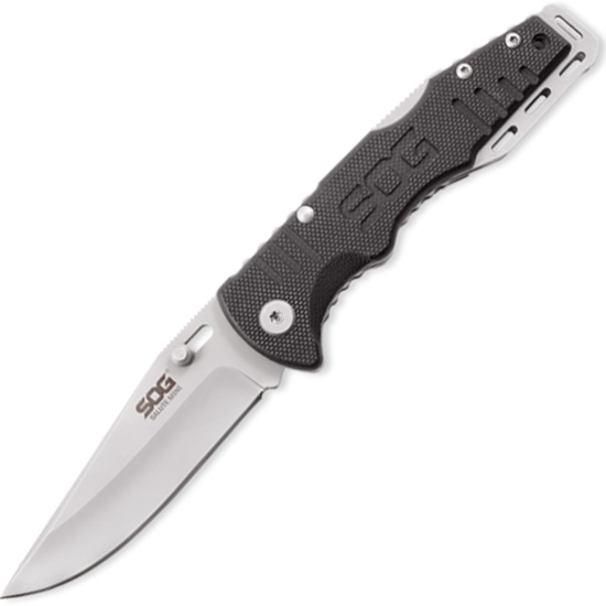 Salute Mini - Satin, Bead Blasted, Clip Point, Straight. Designed as a compact discreet pocketknife, the Salute Mini is still capable of delivering big time. Thanks to an easy opening blade that snaps to attention and a G10 handle that's easy to hold, the Salute Mini is ready to be deployed at a moment's notice. By SOG Knives.