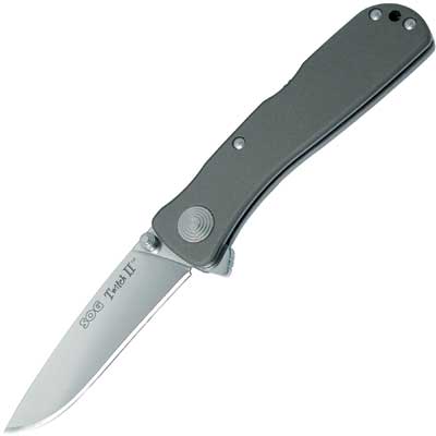 Twitch II. S.A.T. (SOG Assisted Technology) effortlessly propels the blade out once the operator has initiated the one-handed opening action. By SOG Knives.
