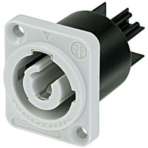 Chassis connector, power-out, 3/16'' flat tab terminals, grey. The powerCON is a locking 3 conductor equipment AC connector with contacts for line, neutral and pre-mating ground contact. It replaces appliance couplers wherever a very rugged solution in combination with a locking device is needed in order to guarantee a safe power connection. By Neutrik.