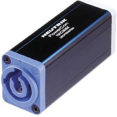 The PowerCon Coupler for linking cables, one side with NAC3MPA (power in) and the other side with NAC3MPB (power out). The PowerCon is a locking 3 conductor equipment AC connector with contacts for line, neutral and pre-mating ground contact. It replaces appliance couplers wherever a very rugged solution in combination with a locking device is needed in order to guarantee a safe power connection. By Neutrik.