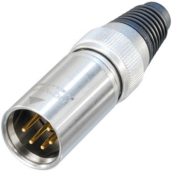 5 pole male cable connector, "heavy duty", metal boot and stainless steel shell, gold contacts. By Neutrik.