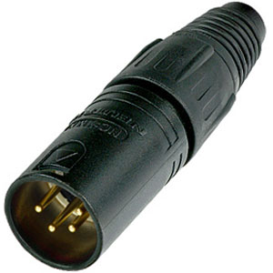 Neutrik 4 pole male cable connector with black metal housing and gold contacts. The "industry standard" XLR cable connector, easy to assemble with only 4 parts and no screws. Compact design with sturdy diecast shell, fibreglass reinforced hard plastic insert and chuck type strain relief for secure clamping of all cables. By Neutrik.