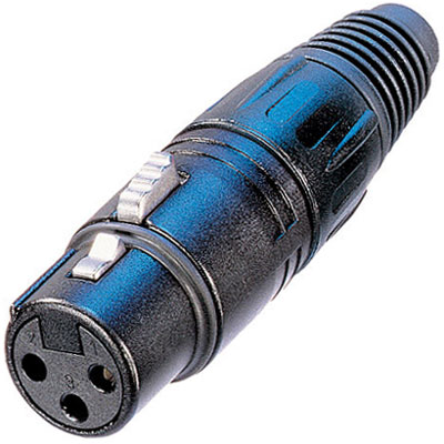 Neutrik 3 pole female cable connector with black metal housing and gold contacts. The "industry standard" XLR cable connector, easy to assemble with only 4 parts and no screws. Compact design with sturdy diecast shell, fibreglass reinforced hard plastic insert and chuck type strain relief for secure clamping of all cables. By Neutrik.