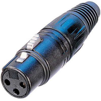 Neutrik 3 pole female cable connector, black metal housing and silver contacts. The "industry standard" XLR cable connector, easy to assemble with only 4 parts and no screws. Compact design with sturdy diecast shell, fibreglass reinforced hard plastic insert and chuck type strain relief for secure clamping of all cables. By Neutrik.