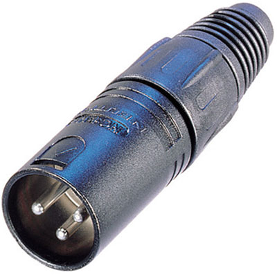 Neutrik 3 pole male cable connector with black metal housing and silver contacts. The "industry standard" XLR cable connector, easy to assemble with only 4 parts and no screws. Compact design with sturdy diecast shell, fibreglass reinforced hard plastic insert and chuck type strain relief for secure clamping of all cables. By Neutrik.