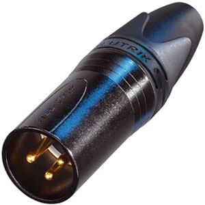 NC3MXX-B 3 pole male cable connector with black metal housing and gold contacts. By Neutrik.