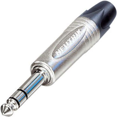 3 pole 1/4" professional phone plug, nickel contacts, nickel shell. By Neutrik.