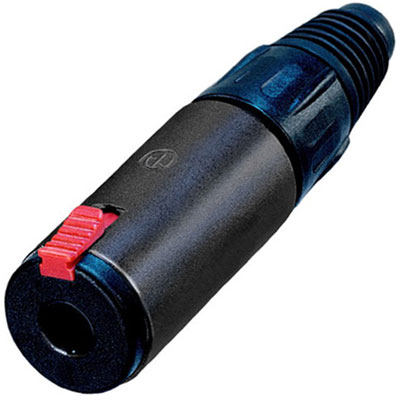 Professional locking 1/4" cable jack for secure in-line connections. Black metal housing, silver contacts, excellent cable protection. The 3 pole phone cable jack in-line version provides stable and secure connections where accidental disconnect or shock and vibration may occur. It latches with standard A-gauge mono or stereo plugs. Plug locks-in automatically when mating and unlocks only by pressing red release tab. By Neutrik.