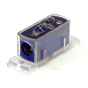 Distribution block. One 4 gauge input to four 8 gauge outputs, rated to 175A. By Phoenix Gold.