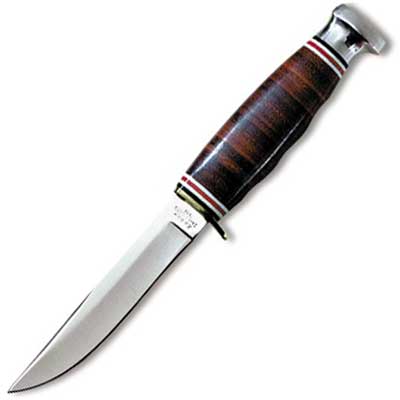Hunter. Dressy enough to give as a gift and practical for field use. Features a stacked leather handle with finger grips. With leather sheath. By Ka-Bar.