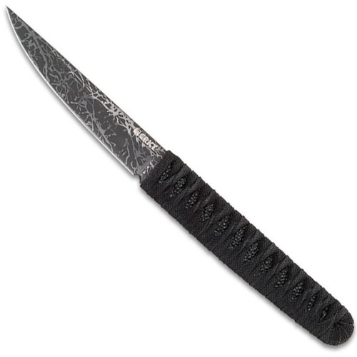 The Obake by Lucas Burnley is bold. It's a throwback to a classic Japanese Kwaiken design that's ready to throw down, if trouble turns up. The distinctive blade of this full tang fixed blade knife has a gray titanium nitride finish that is acid etched to give it a unique pattern that will be exclusive to each fortunate owner. The handle has a katana style nylon cord wrap over a black faux ray skin. The sheath of the Obake is made from glass filled nylon that will give consistent retention even in hot environments. A paracord lanyard on the sheath is designed to attach to your belt loop and keep the sheath in place when you deploy the knife. A skull bead adds a not-so-subtle accent to the paracord lanyard. This small fixed blade knife comes with a sturdy belt carry system and hardware that attaches to the grommets on the sheath. The Obake isn't looking for work, but it shows up looking like a boss when it's time to get a job done. By Columbia River.