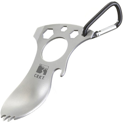 Eat'N Tool - bead blast, spoon, fork, bottle opener, screwdriver/pry tip, metric wrenches, carabiner, clam only. By Columbia River.