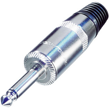 1/4" plug, 2-pole, with large shell for speaker cable. Large metal handle, rubber bushing. By Neutrik.