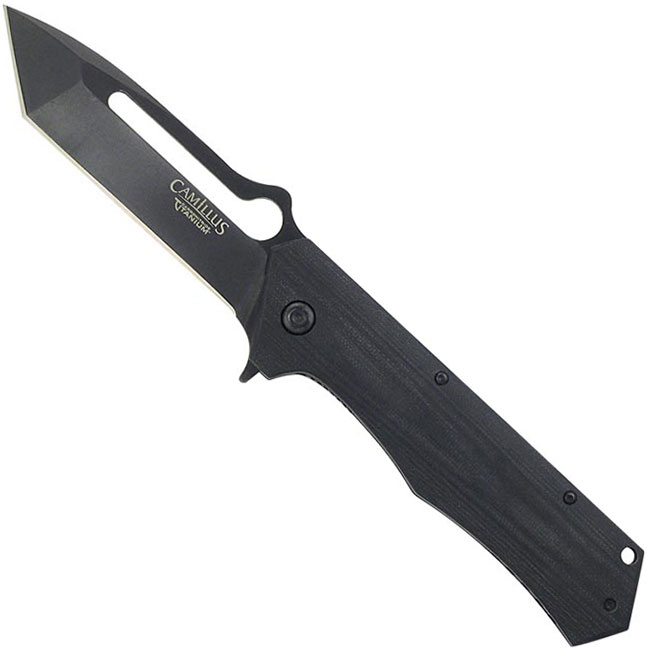 Camillus 18683 Beast 9.75" Carbonitride Titanium Folding Knife with G10 Handle. VG-10 Japanese Steel / Carbonitride Titanium blade won't blister, flake, peel or chip and is up to 10x harder than untreated steel so it stays sharper for a longer period of time. Ergonomic G10 Handle. Modified Tanto Blade. Tactical. Liner Lock and Pocket Clip. Blade length is 3.75". Lifetime Warranty. By Camillus.