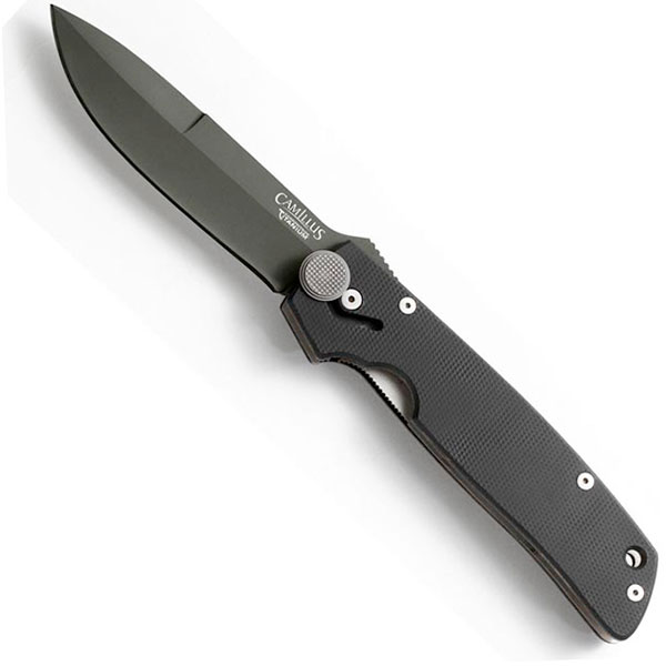 Camillus 18533 9'' Carbonitride Titanium Cuda Folding Knife with Quick Release and G10 Handle. AUS-8 Japanese Steel / Carbonitride Titanium won't flake, blister, chip or peel and is up to 10x harder than untreated steel so the blades stay sharper, longer. Hollow ground blade. Quick-action blade release. Ergonomic G10 Fiber handle. Lifetime Warranty. By Camillus.