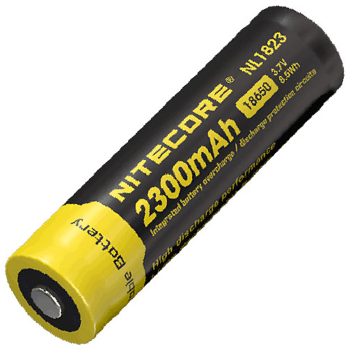 Nitecore 18650 Li-ion High Performance Rechargeable Battery, 2300mAh 3.7V 8.5Wh. Integrated battery overcharge / discharge protection circuits. High discharge performance Li-ion Rechargeable Battery. By Nitecore.