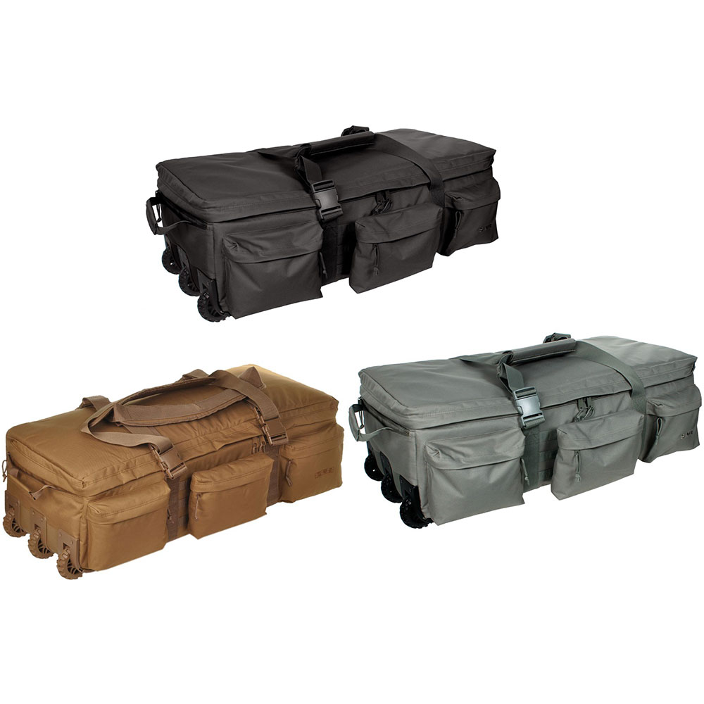 Rolling Load Out Bag. Colors available in black, coyote brown, or foliage green. Generous main compartment with zipper along perimeter for complete access to cargo. Internal and external zippered pockets. Adjustable carry handle which can be used as backpack straps. Concealable pull handles, compression straps, detachable zippered pouch and MOLLE / PALS panel. Skid rails and (3) large diameter wheels to easily roll on firm surface or sand. By Sandpiper Of California.