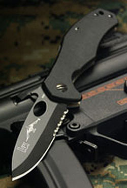 CQC-10, feels great in the hand and features a brutish spear point blade profile. This knife represents a great choice for both military and Law Enforcement because of its true utilitarian design. Black-Teflon finish, available in plain or partially serrated edge. By Emerson.