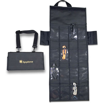 Spyderco SP2 Small Spyderpac. Sixteen-pocket SpyderPac is an impressive and safe way to carry and display your knife collection. It's half the size of the large SpyderPac and fits neatly in a suitcase or portfolio. Constructed from heavy-denier polyester Cordura, the pack has sixteen deep pockets sized to hold even larger folders. Each pocket is fronted with a clear plastic window for viewing knives tucked inside. It tri-folds over and seals closed by way of a Velcro strip running the width of the pack. The knives remain secure and separated in their pockets and cannot rub or scratch against each other. An adjustable length shoulder strap attaches with two durable steel D-rings letting you hang the pack for display on a wall or sling it over your shoulder to take with you. Spyderco's name and bug logo are embroidered in gold thread on the closing flap. Available in black. By Spyderco.