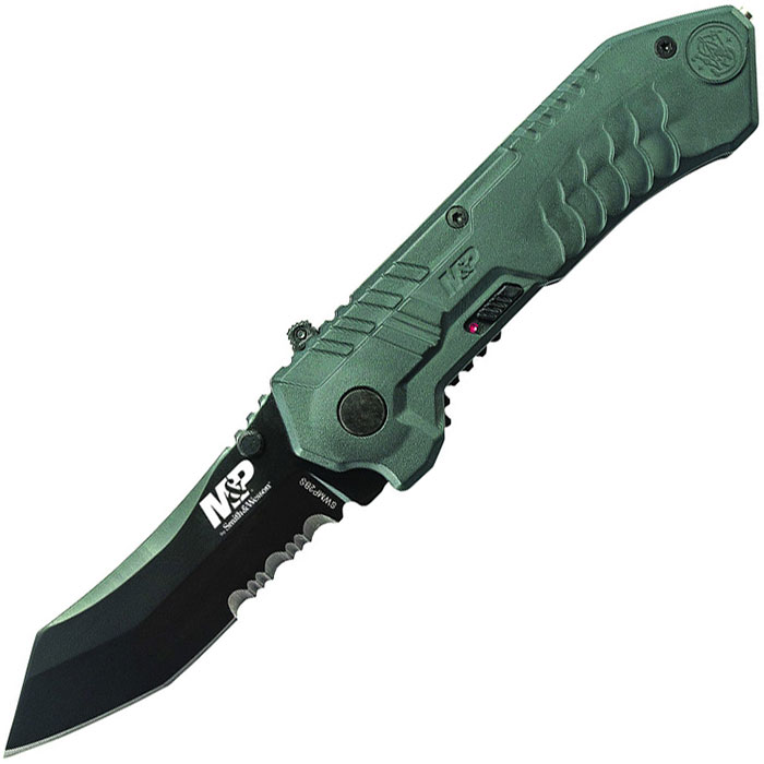 Smith & Wesson - Military & Police M.A.G.I.C. Assisted Opening Liner Lock Folding Knife, black 4034 stainless steel partially serrated clip point tanto blade with ambidextrous thumb knobs and jimping, black aluminum handle with black rubber inlay, safety lock, glass break, and pocket clip. By Taylor Cutlery.
