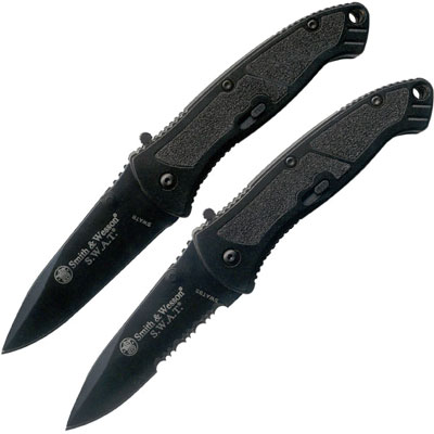Smith & Wesson - Large MAGIC Assisted Opening S.W.A.T., Teflon coated drop point blade, plain or 40% serrated, T6061 aluminum handle with pocket clip. By Taylor Cutlery.
