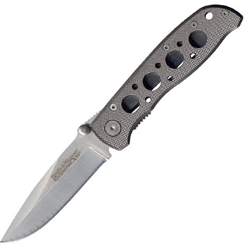Smith & Wesson - Cuting Horse Extreme OPS silver knife with holes, 4.1" Plain blade, Silver aluminum handle, w/ clip. By Taylor Cutlery.