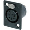 Neutrik 5 pole female receptacle, solder contacts, black metal housing, silver contacts. Smallest available traditional style metal panel mount connector with large solder cups for ease hard wiring. By Neutrik.