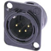 4 pole male receptacle, solder cups, black metal housing, gold contacts. Universal D-size metal body XLR panel mount series. UL recognized component. By Neutrik.