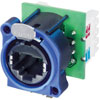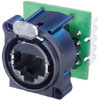EtherCon Horizonal PCB mount RJ45 receptacle, A-Series cutout with latch lock, max. panel thickness 3 mm. The EtherCon Series is a ruggadized and lockable RJ45 connector system, optimized for proaudio, video and lightning network applications. By Neutrik.