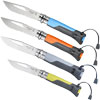 Opinel No 8 Outdoor folding knife. Blue, orange, green, or gray. This heavy duty survival knife features a 2.5 mm thick 12C27 sandvik blade, a thick serrated area, an integrated 4 seasons 110 db survival whistle and a shackle key. By Opinel Knives.