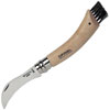 Opinel No 8 Mushroom Knife. Created by Opinel to make it easier to cut and prepare mushrooms, this tool has a thin, curved blade with a serrated back, for easy removal of the cuticle. Its natural varnished beech handle incorporates a boar hair brush for easy removal of soil. Pierced handle. By Opinel Knives.